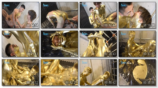 金色の乳首を舐め、金色に染まったチンポをしゃぶり合う!