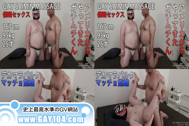 167cm 95kg 25才 かわいいむっちり青年が、熊雄と催◉セックスを体験してみたい!ということではるばるアメリカから遊びに来てくれました!さっそく熊雄は英語を使ってむっちり青年を深い催◉状態へ堕としていく!催◉の掛かりがバッチリなむっちり青年は、目がトロンとした深い催◉状態に!熊雄はむっちり青年の潜在意識にハレンチな暗示を刷り込んでいく!熊雄の事が世界で一番理想的な男性に見えてしまい、好きで好きでたまらなくなってしまう!熊雄の先走りダラダラの自慢のデカマラを恍惚の顔をしてしゃぶりまくる!アナルも完全にリラックスしてしまいトロトロになった状態で、がっつり熊雄のチンポでGスポットを当て掘りされる!そして最後は我慢できなくなってしまい、濃厚なザーメンをトコロテン射精して茫然自失のむっちり青年!「今までに経験した事の無い最高のセックスでした!」大満足なむっちり青年でした。あなたも催◉で、あり得ない程の最高のセックスを体験してみませんか?